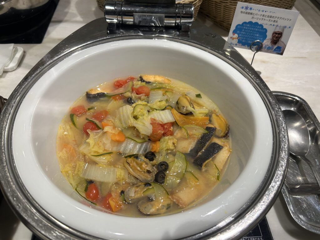 - 旬の道産鰈とパーナ貝と白菜のアクアパッツァ ガーリックトースト添え