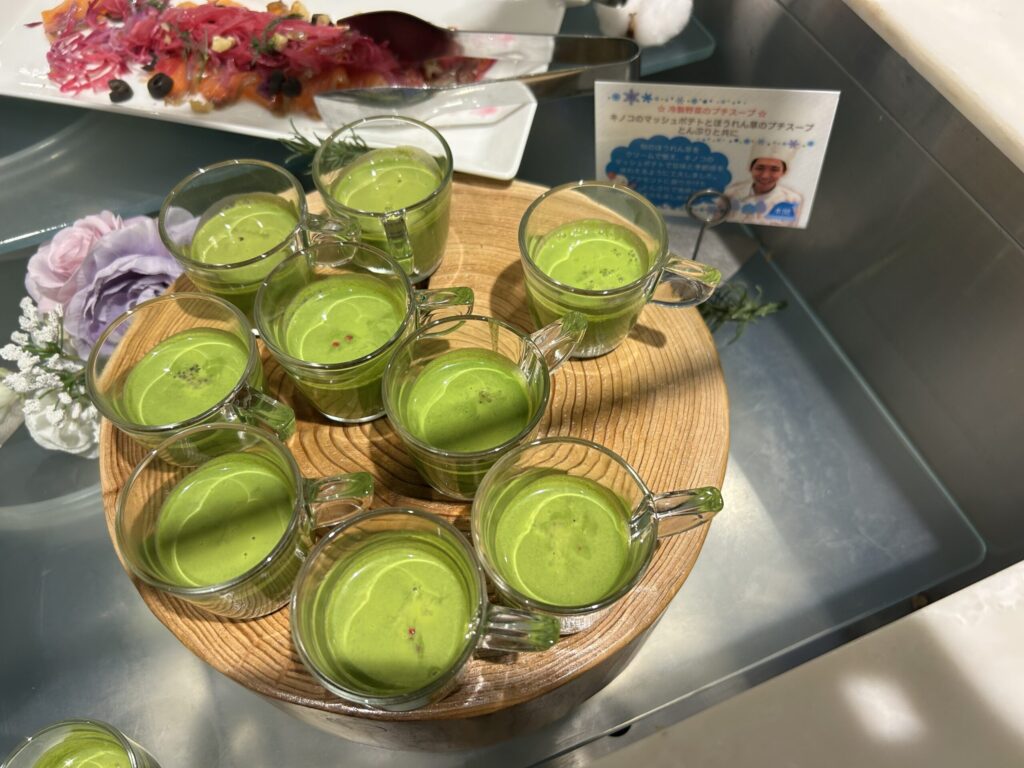 - キノコのマッシュポテトとほうれん草のプチスープ とんぶりと共に