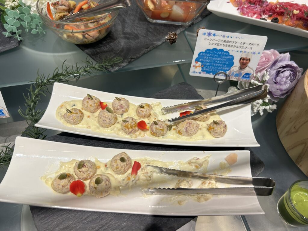 - コーンビーフと南瓜のクリームチーズボール レンズ豆ともち麦のタルタルソース