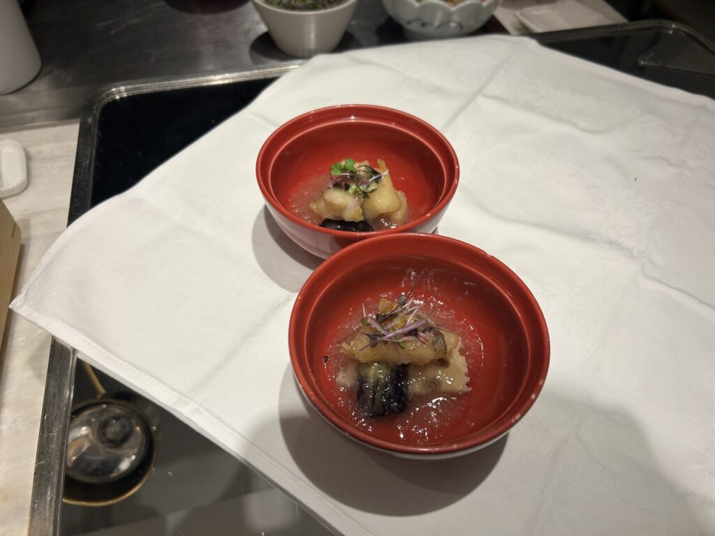 - 合鴨と茄子の揚げ浸し 梅と酢漬け生姜の白和え