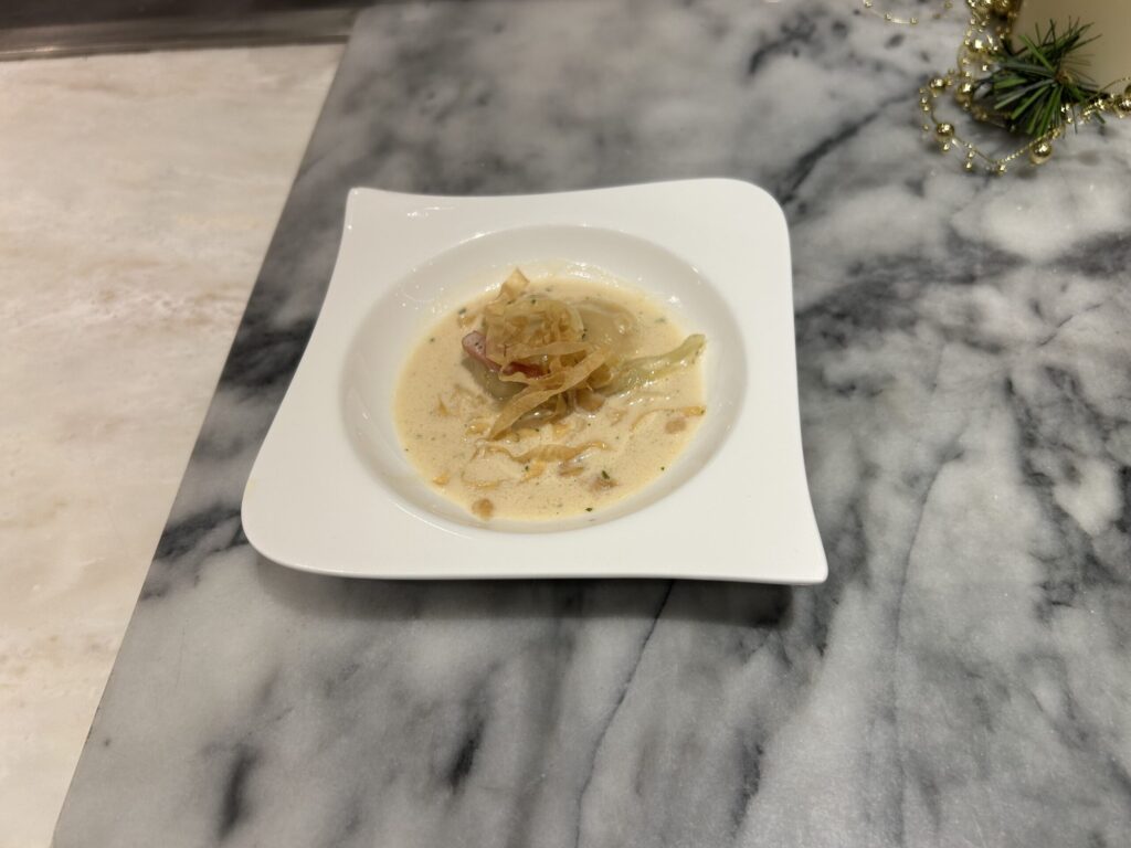 • 厚切りベーコンとポルチーニ茸のラビオリ クリームオニオンスープ仕立て