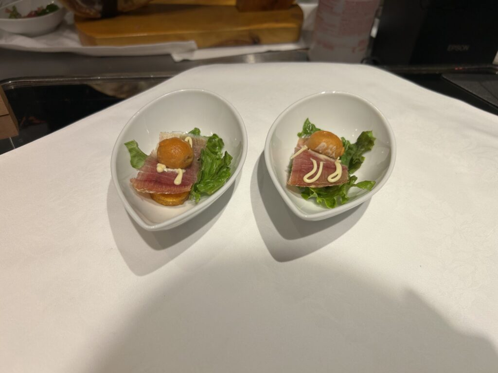 • スペイン産ハモンセラーノ 南瓜もちのオレンジカラメル仕立てマオンソース