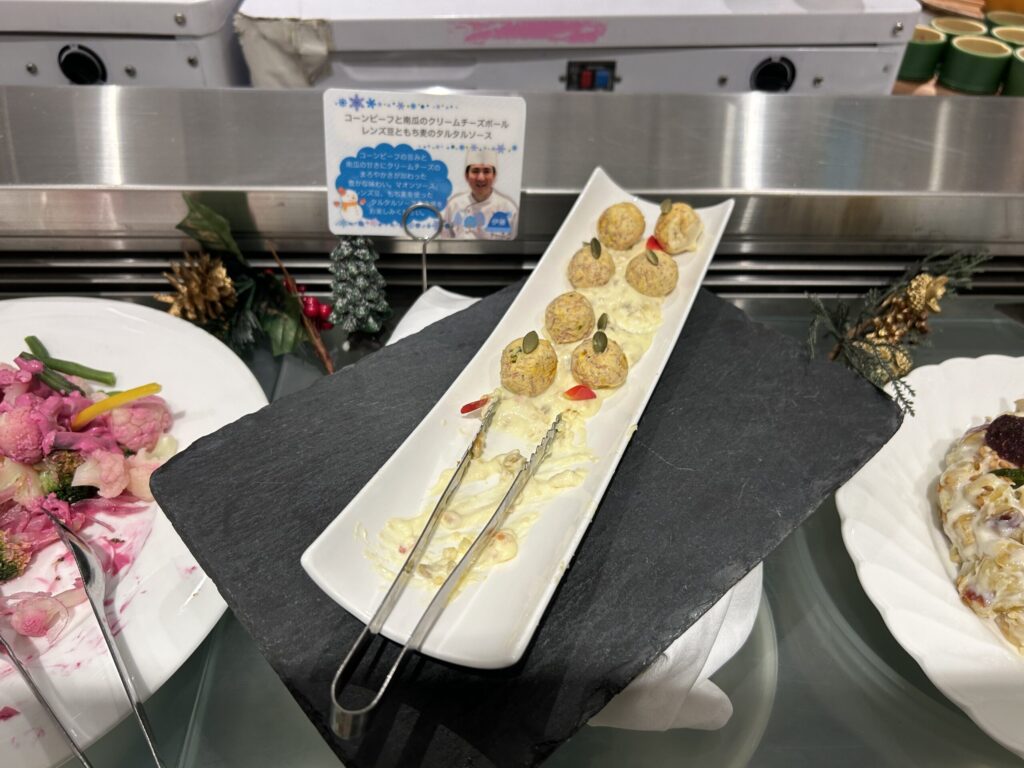 • コーンビーフと南瓜のクリームチーズボール レンズ豆ともち麦のタルタルソース