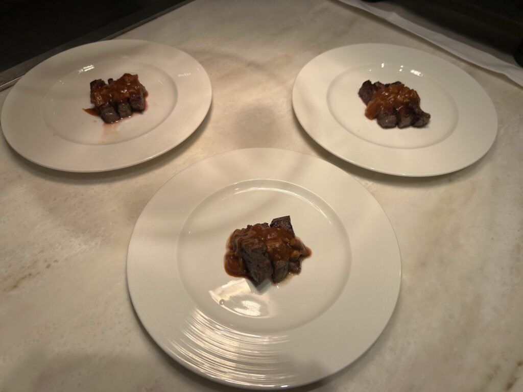 特に印象に残ったのは、北海道産牛肉のステーキ(オニオンナポリタンソース)、蛸と辛子明太子のジェノベーゼスパゲッティ。