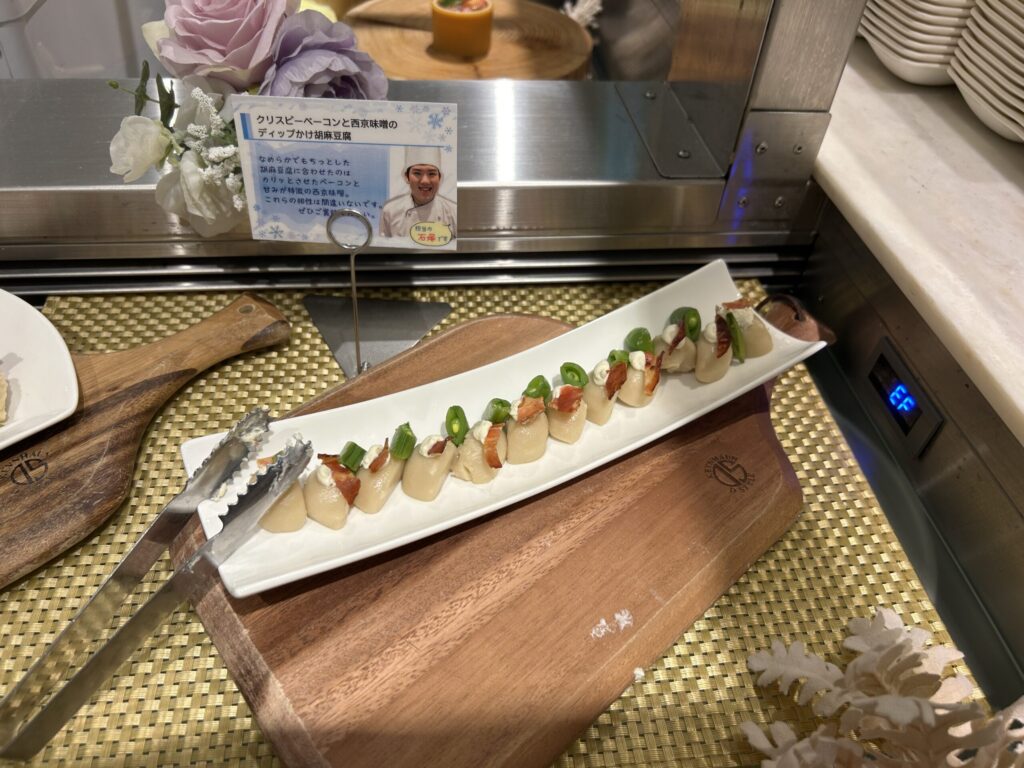 • クリスピーベーコンと西京味噌のディップかけ胡麻豆腐
