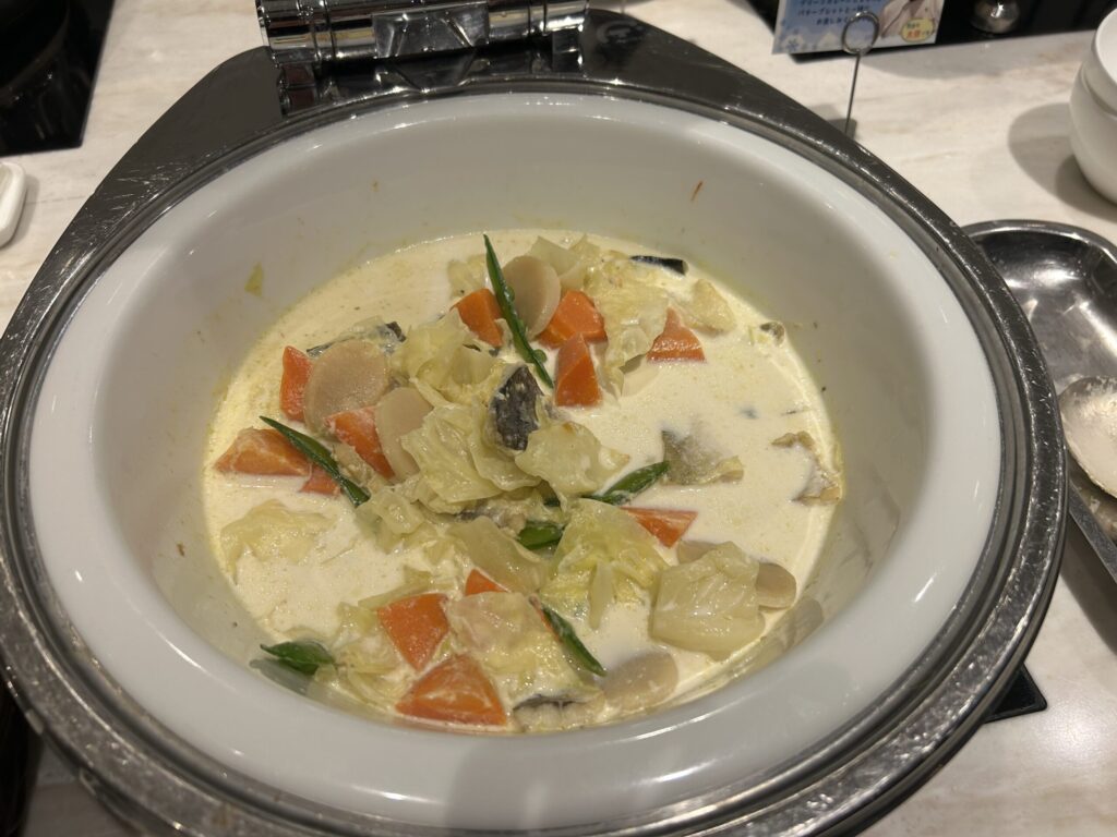• 氷下魚とタイラギと越冬キャベツのグリーンカレー仕立て バターブレッド添え
