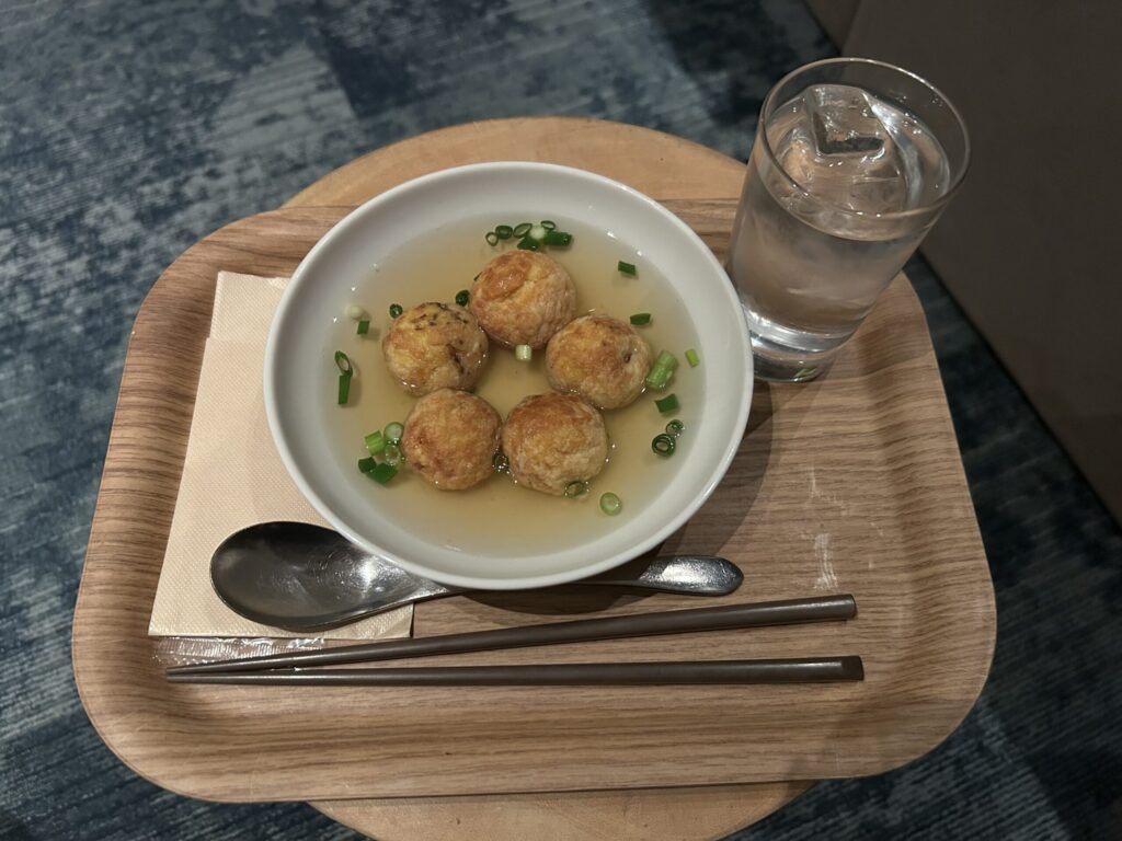 はこやきはたこの代わりにイカを使用したたこ焼き風のホテルオリジナルメニューで、出し汁でいただくようです。
