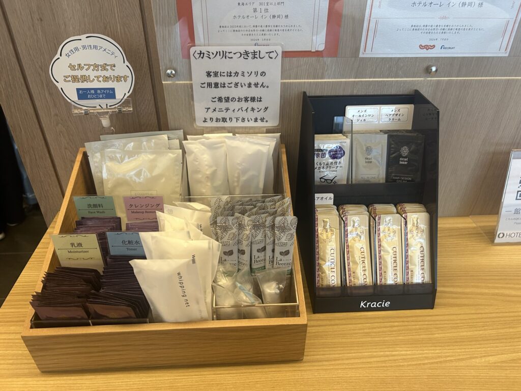 基本的なものは客室に用意されてますが、フロント横にはセルフ方式のアメニティがありました。