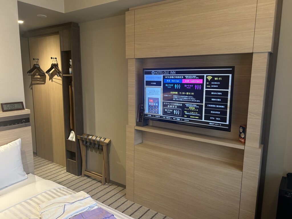 テレビは大きめで見やすく、大浴場やラウンジの混雑状況が確認できて便利でした。
