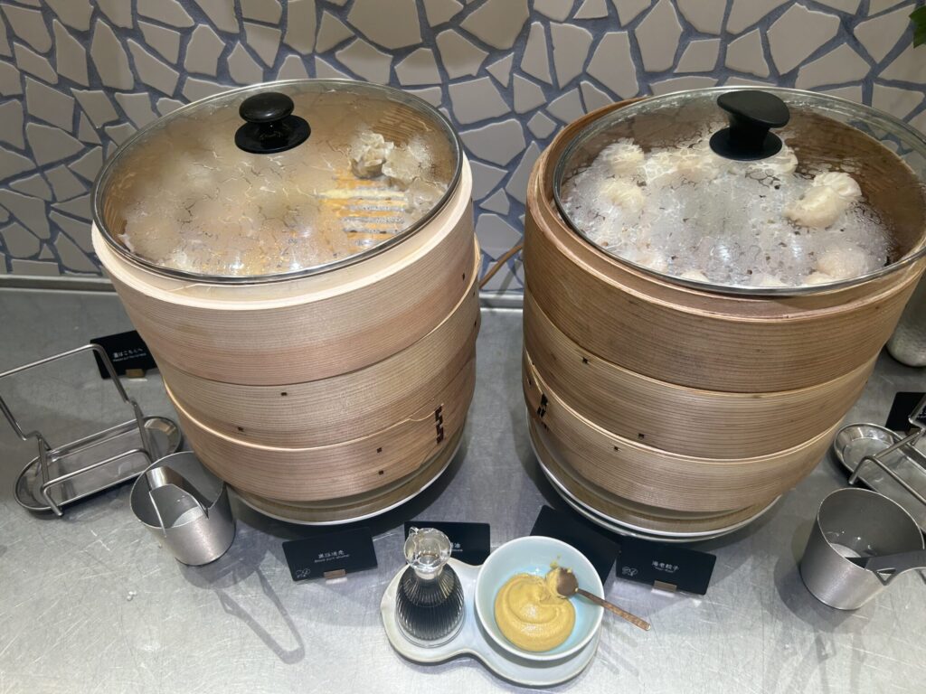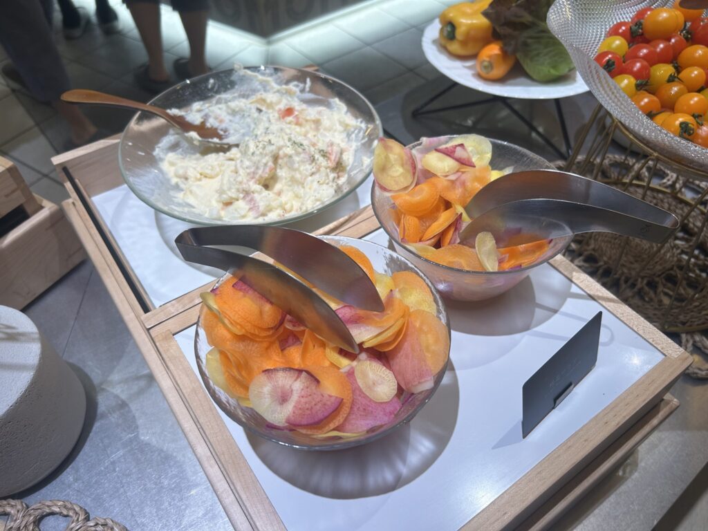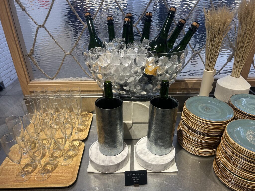 ライブキッチンが豊富なビュッフェ形式で、スパークリングワインも飲み放題。