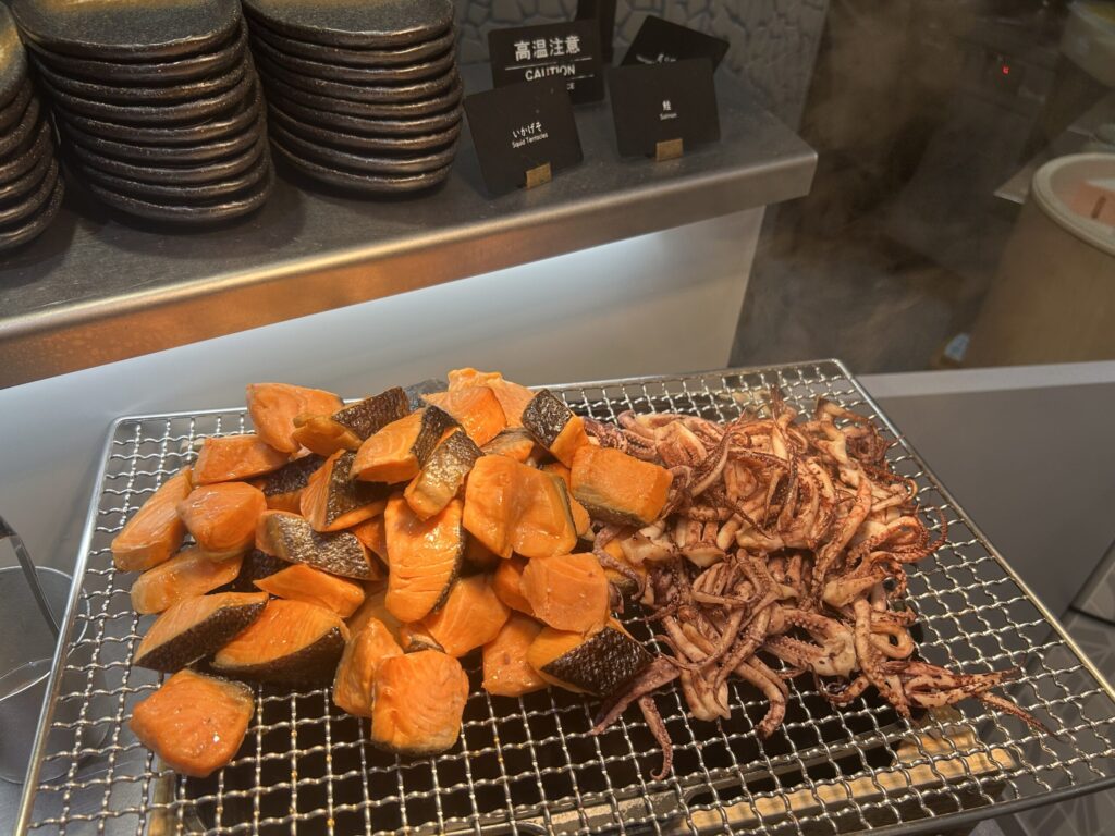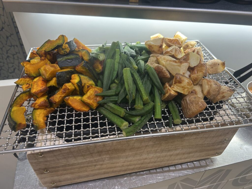 - 炙り焼き(いかげそ・鮭)(かぼちゃ・オクラ・ジャガイモ)