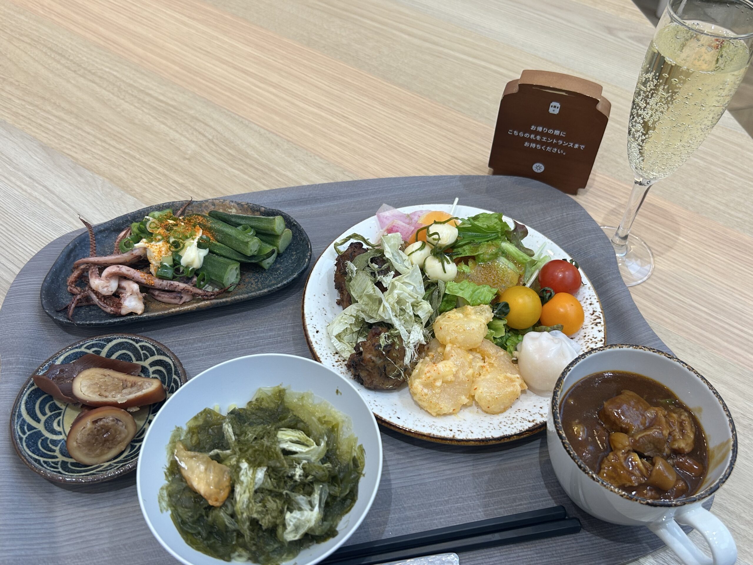 ライブキッチンが豊富なビュッフェ形式で、スパークリングワインも飲み放題。