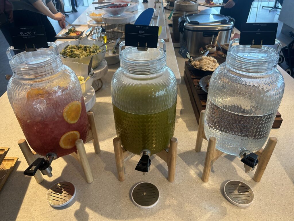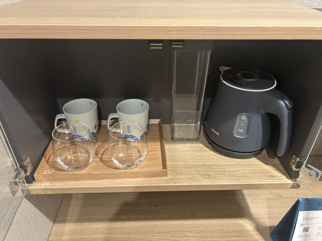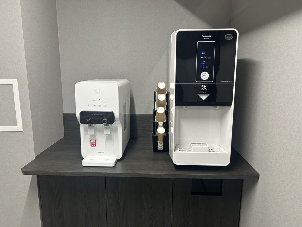 部屋にはウォーターサーバー用のピッチャーが備え付けられていて、各階にあるウォーターサーバーから自由にお水を入れられるのが便利でした。