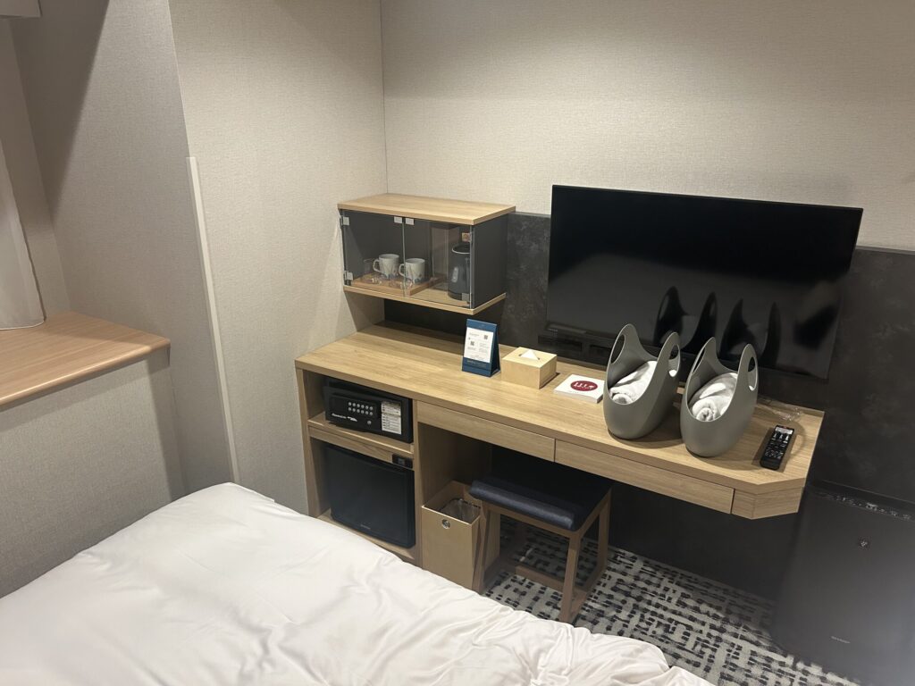 デザインはかわいくて清潔感がありますが、ビジネスホテルの中でもかなり狭め。