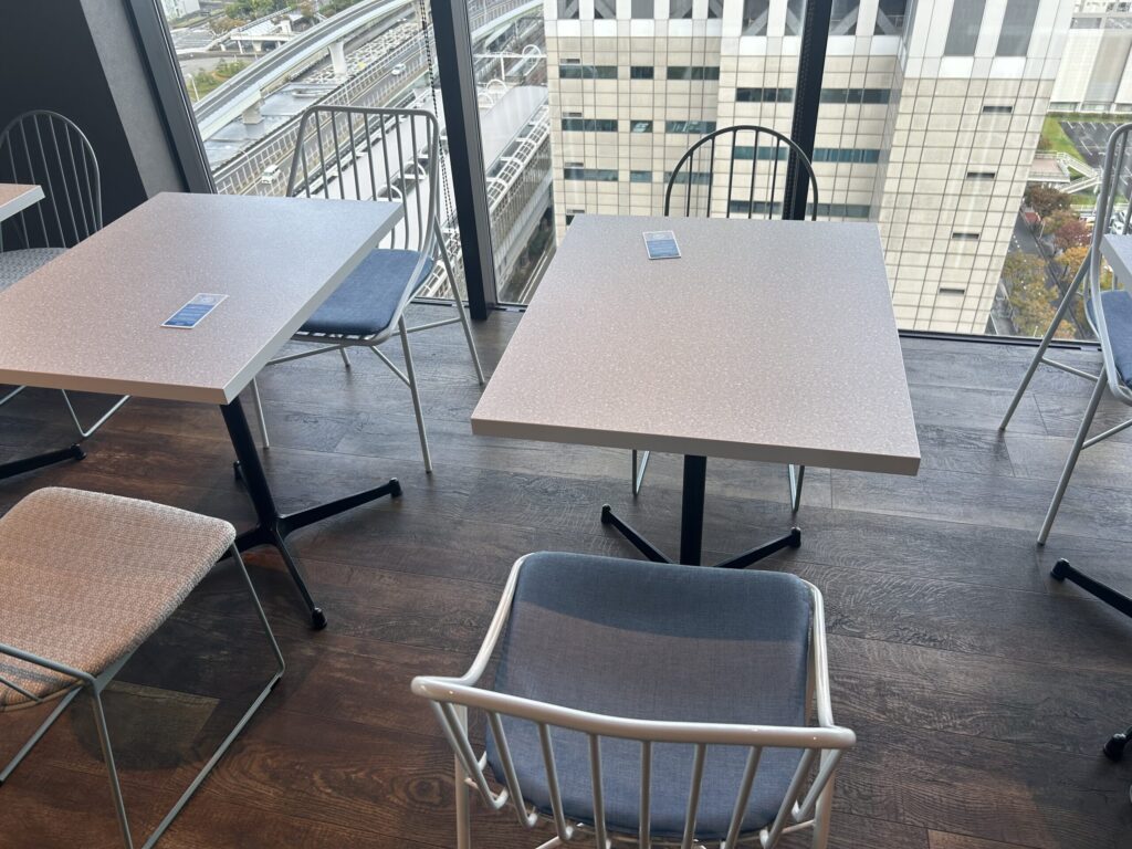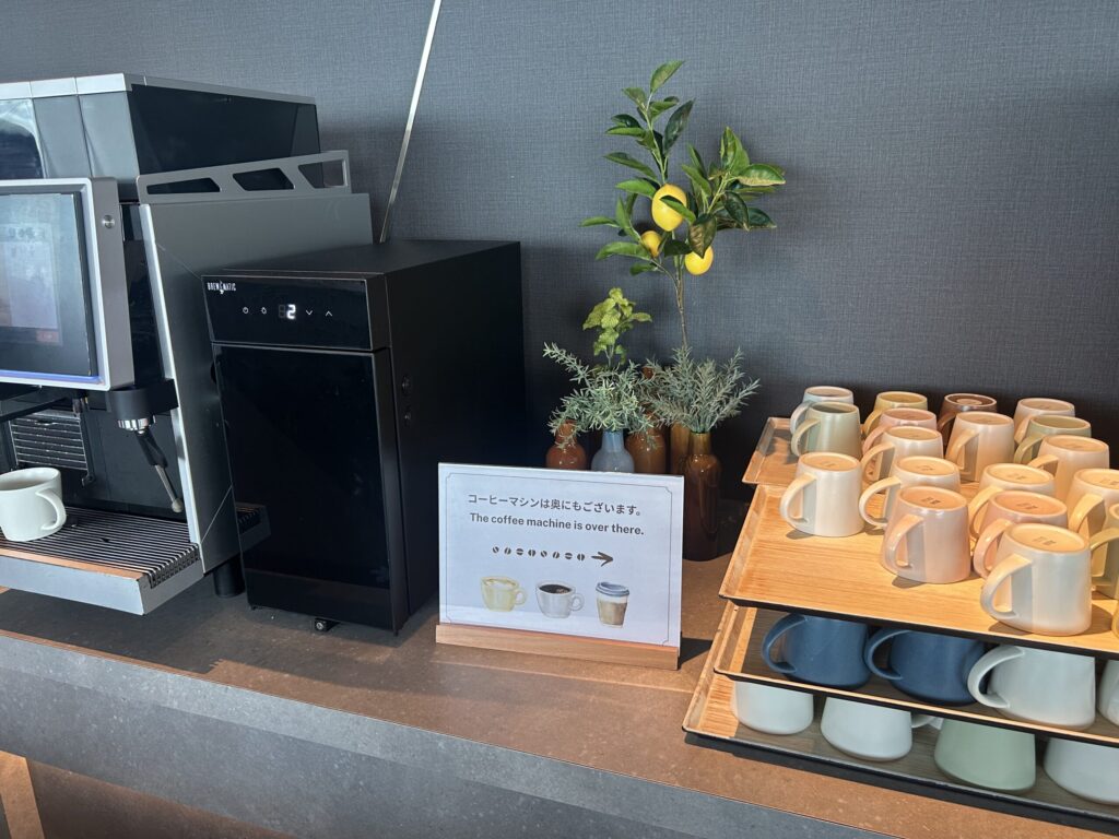 1階ロビーには、電源付きのカウンタースペースやテーブル席があり、チェックイン前後の待ち時間に作業したり休憩したりできるのも便利でした。