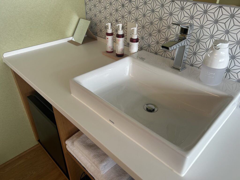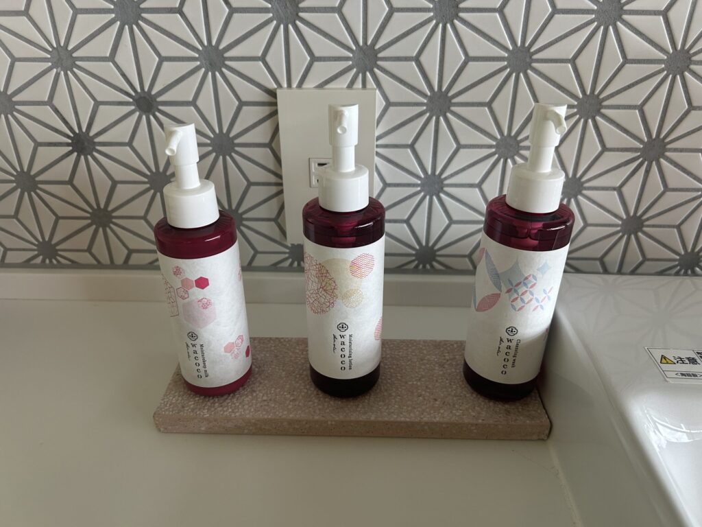 部屋の中に洗面台がある配置で、スキンケア用品がボトルで置いてありました。