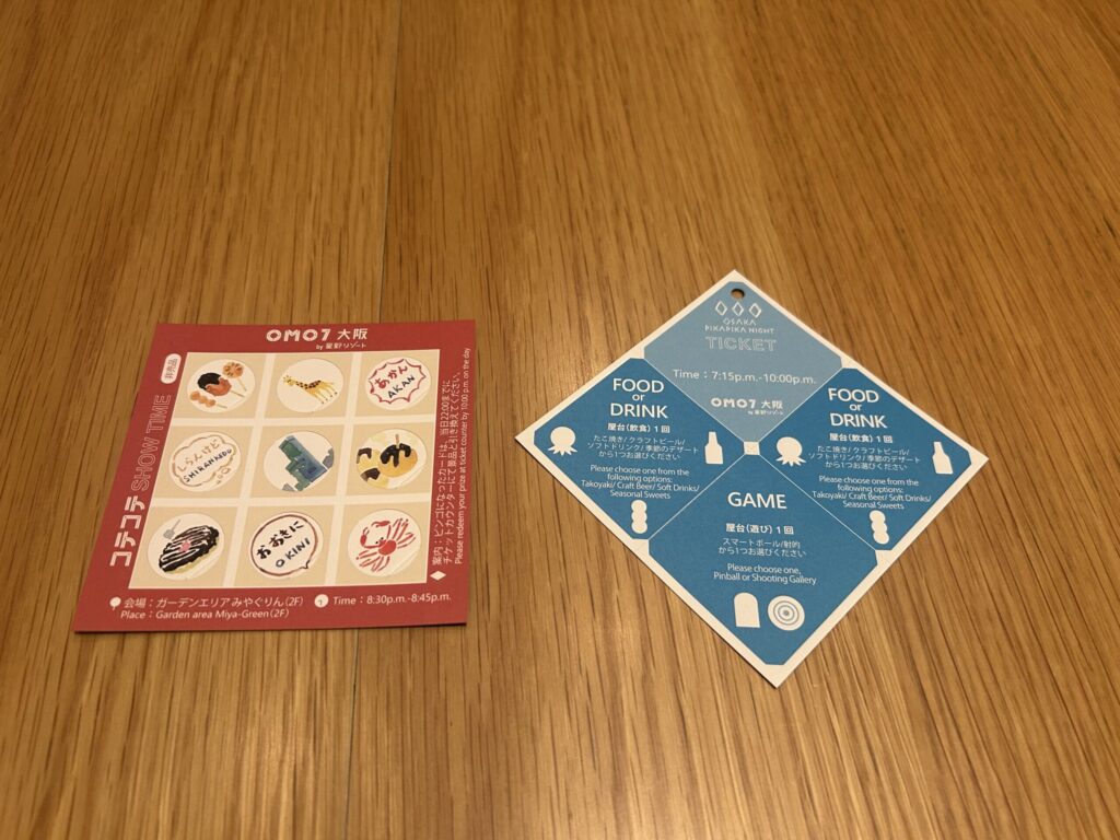 宿泊者は食を楽しめるチケット2枚と遊びを楽しめるチケット1枚、ビンゴカードがもらえます。