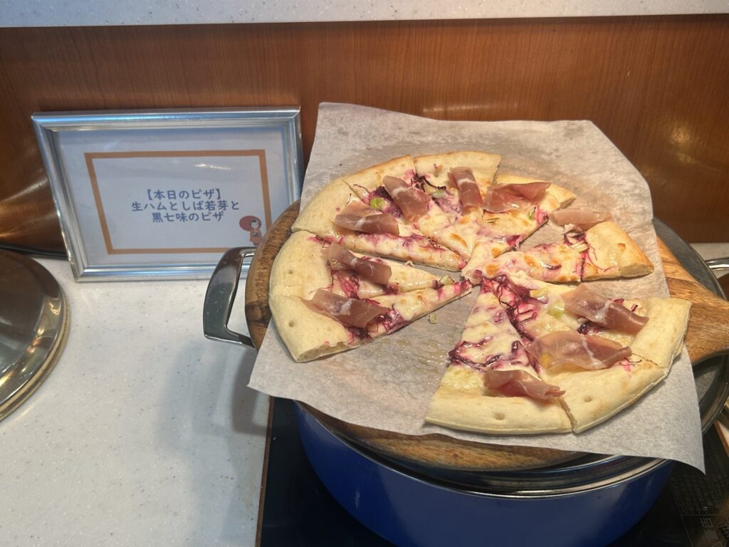 - スタッフの実演 生ハムとしば若芽と黒七味のピザ