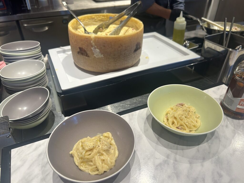 実演のローストビーフとカルボナーラは、ビュッフェの中でも特に美味しかったメニューです。