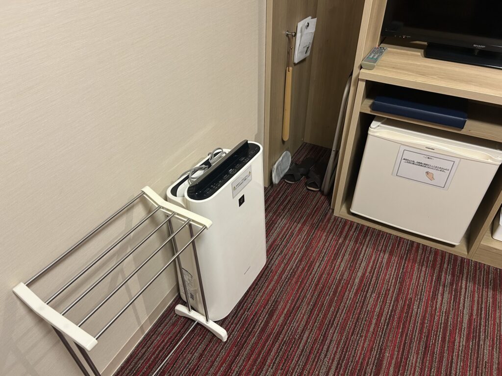 加湿機能付き空気清浄機や冷蔵庫、電気ケトルなど設備も揃っており、ビジネスにも遠征にもぴったりの客室です。
